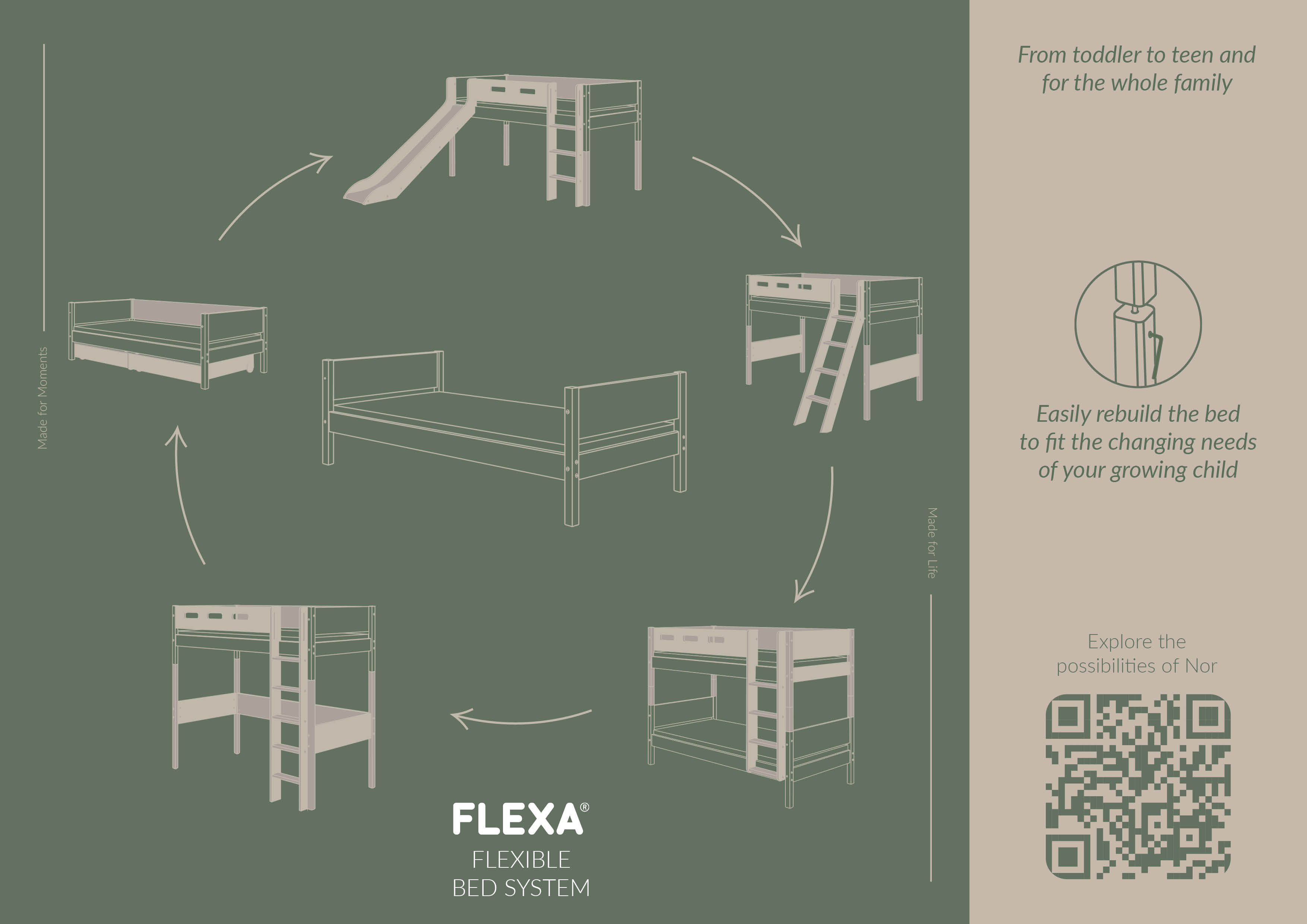 Sehen Sie sich unsere Anleitung an, um Ihr Nor-Bett in verschiedene Szenarien umzubauen. Wir wachsen mit und unsere Nor-Serie lässt sich auf neue Art und Weise anpassen und umbauen, um den sich ändernden Bedürfnissen Ihres Kindes gerecht zu werden.